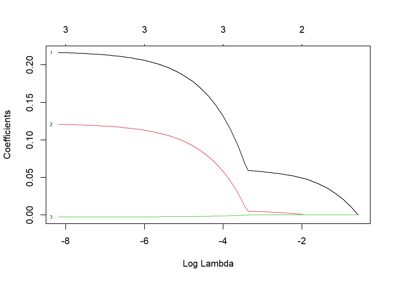 # Plotting the coefficient pathplot(lasso_model, xvar ="lambda", label =TRUE)