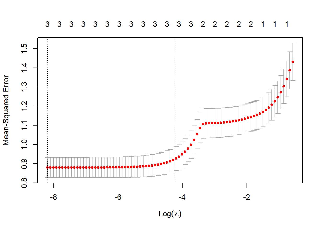 # Create a ggplot# Plotting cross-validation plot to see the optimal lambdaplot(cv_lasso)