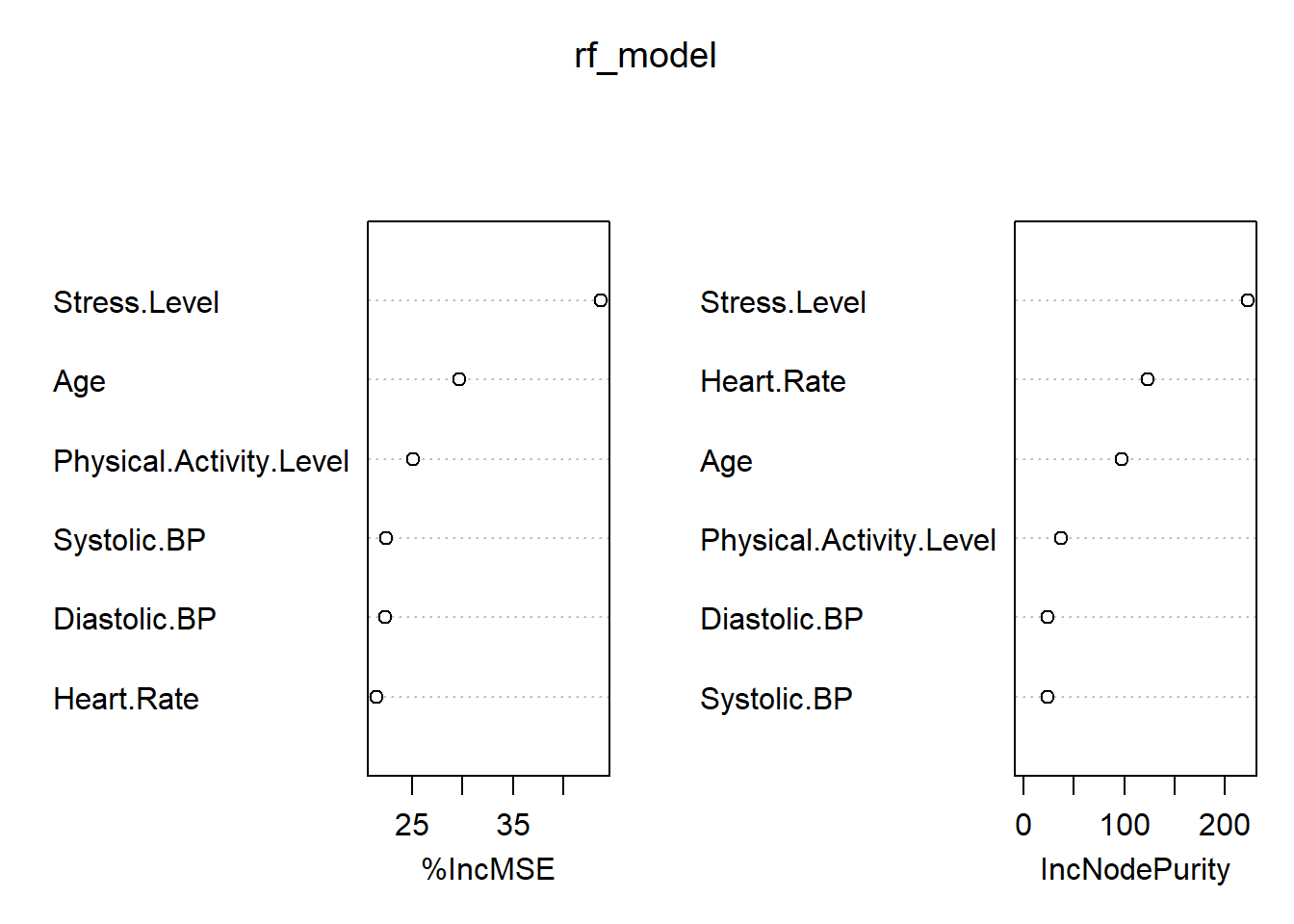 # Load the datasetdata1 <-read.csv("C:/Users/ACER/Desktop/New folder/Sai Sriram Uppada/FinalProject/Sleep_health_and_lifestyle_dataset.csv") # Replace with the path to the original dataset# Split the "Blood Pressure" into "Systolic BP" and "Diastolic BP"data1 <- data1 %>%mutate(Systolic.BP =as.integer(sub("/.*", "", Blood.Pressure)),Diastolic.BP =as.integer(sub(".*/", "", Blood.Pressure)))# Fit Random Forest model to predict sleep qualityset.seed(123) # for reproducibilityrf_model <-randomForest(Quality.of.Sleep ~ Age + Physical.Activity.Level + Stress.Level + Heart.Rate + Systolic.BP + Diastolic.BP, data=data1, importance=TRUE, ntree=500)# Check out the model summaryprint(rf_model)