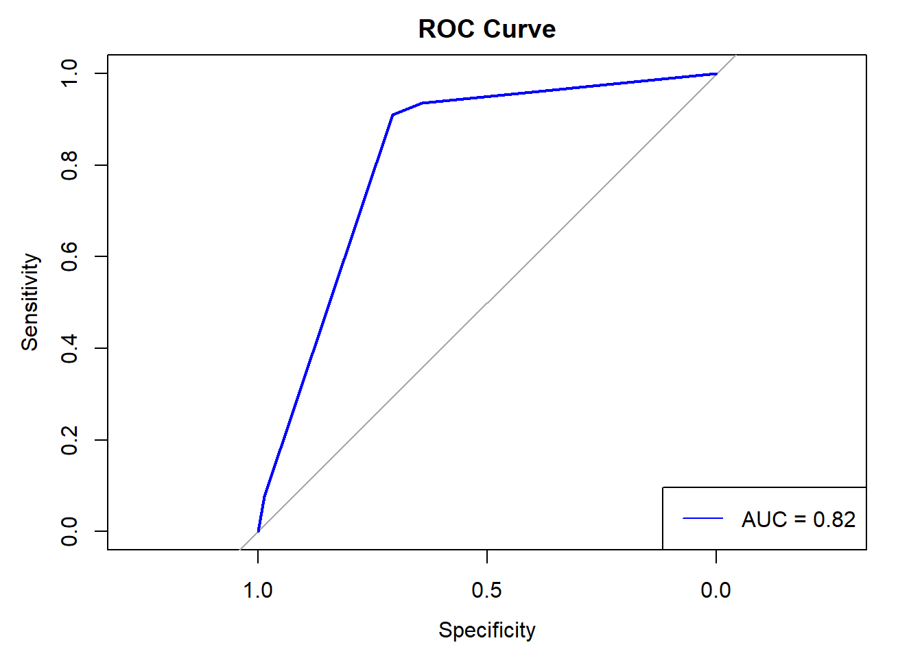 # Plot ROC curve with AUCplot(roc_curve, main ="ROC Curve", col ="blue")legend("bottomright", legend =paste("AUC =", round(auc(roc_curve), 2)), col ="blue", lty =1)